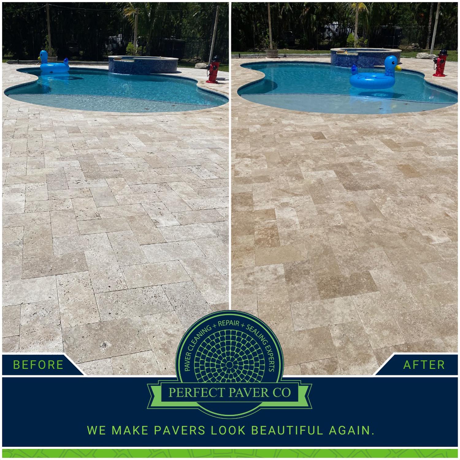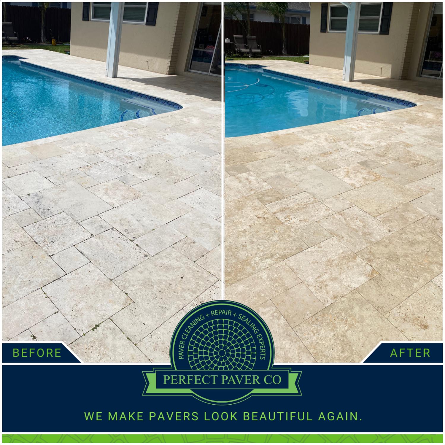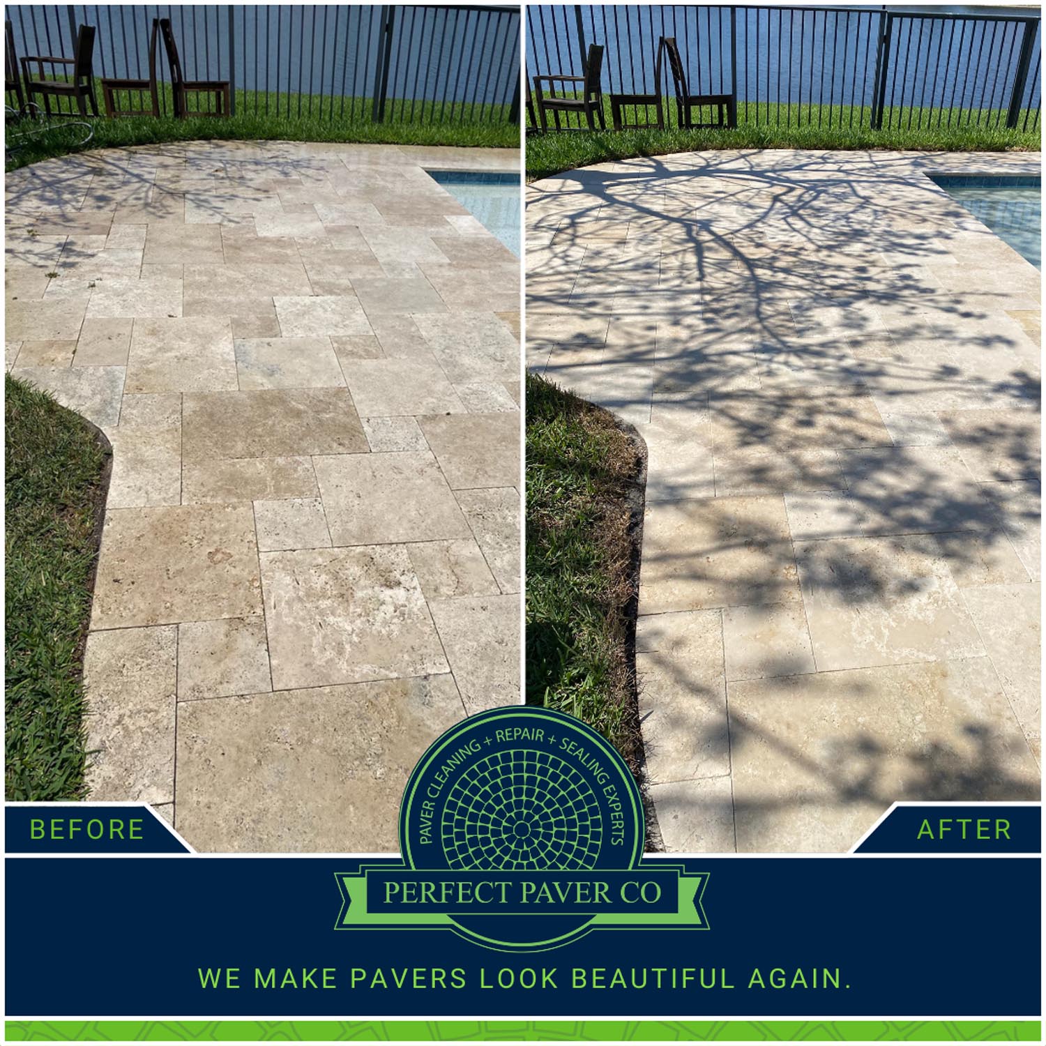 Travertine is a beautiful natural stone commonly used around pool decks and driveways. Because it is porous, travertine pavers benefit from professional cleaning and sealing.