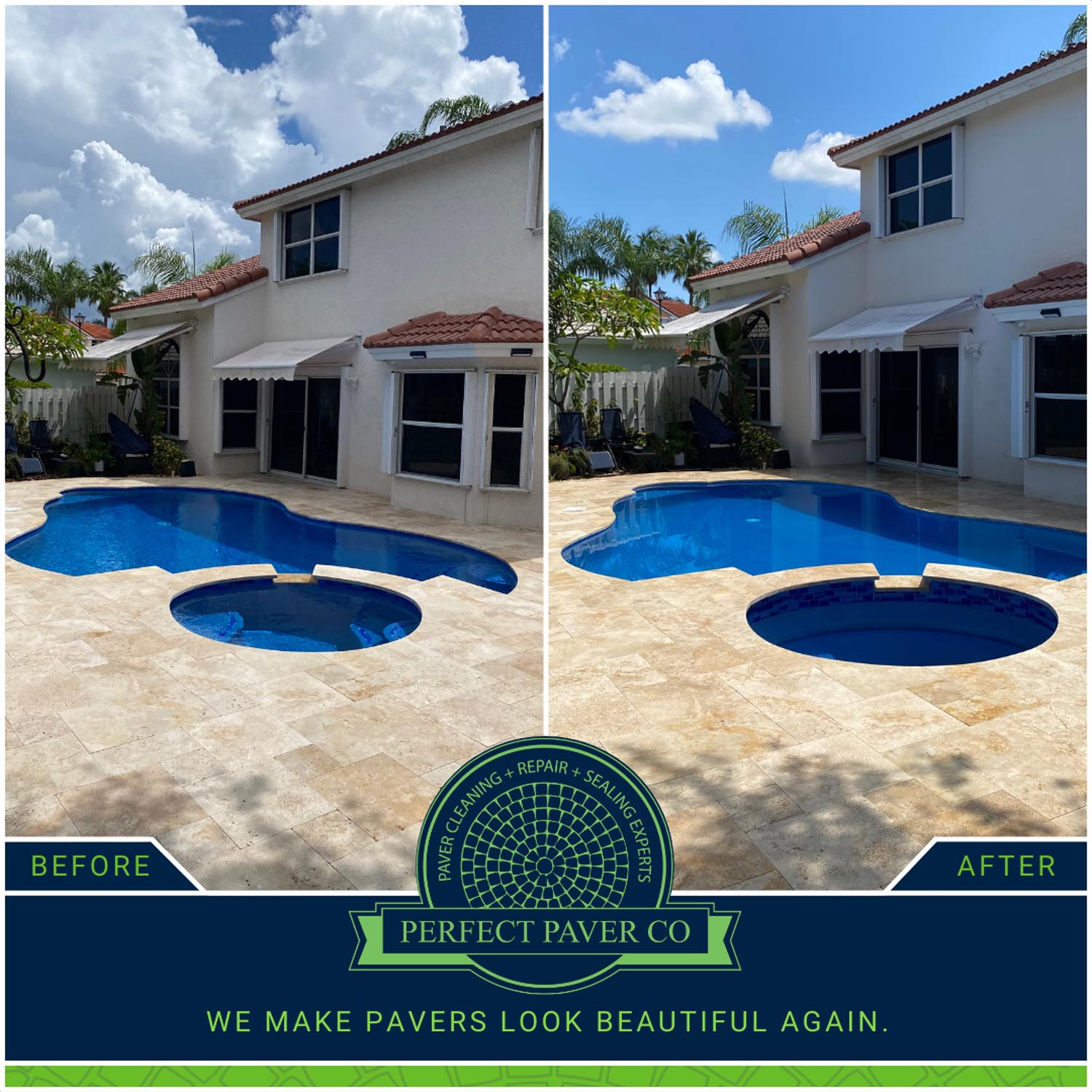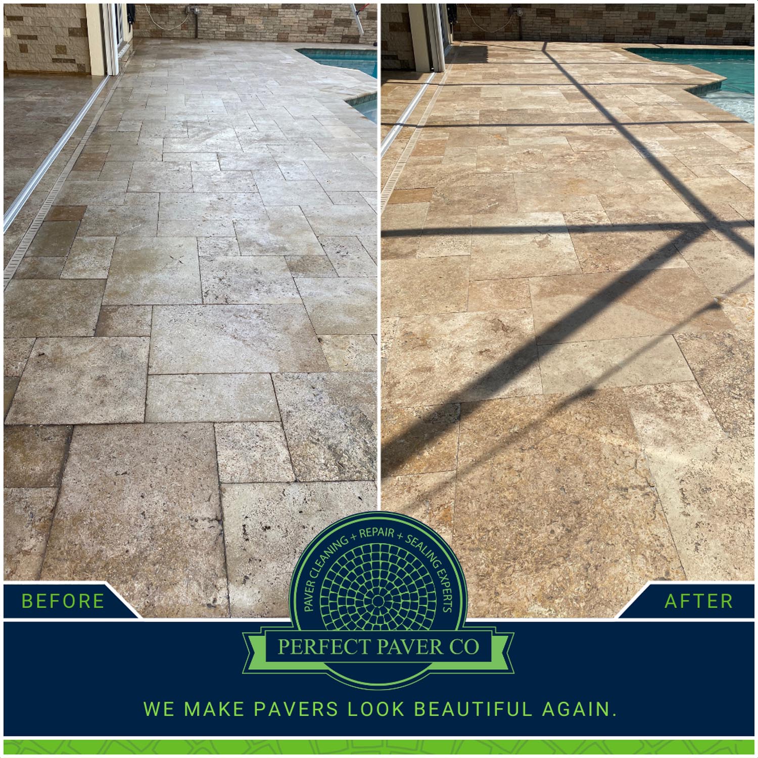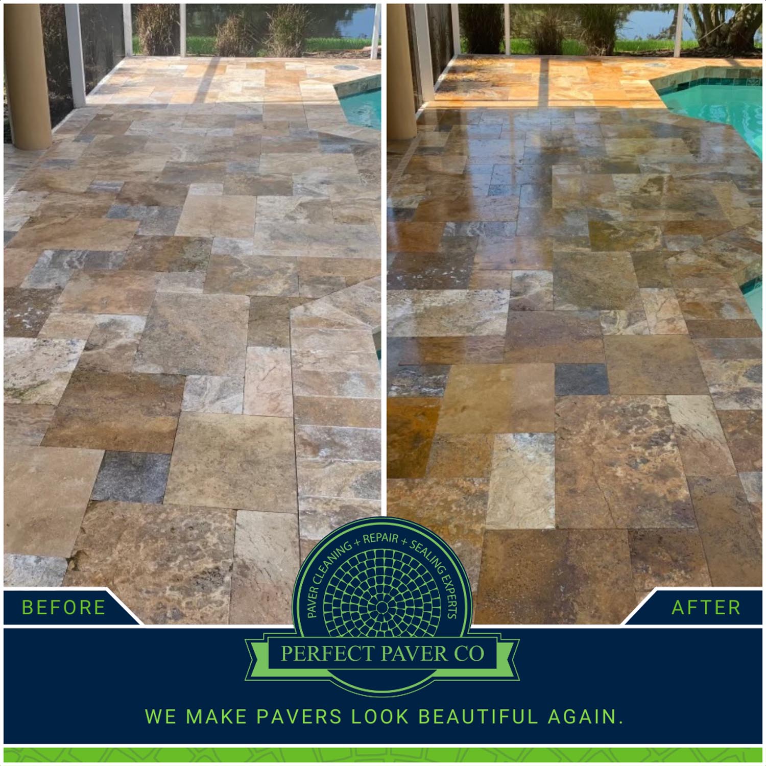 Travertine is a beautiful natural stone commonly used around pool decks and driveways. Because it is porous, travertine pavers benefit from professional cleaning and sealing.