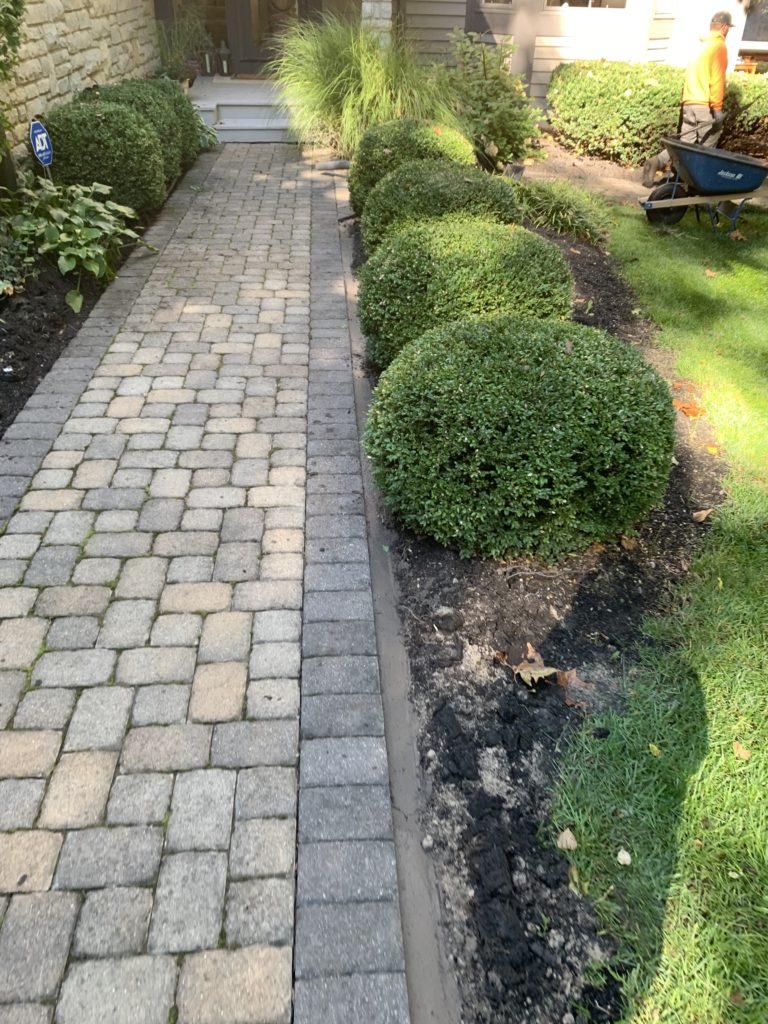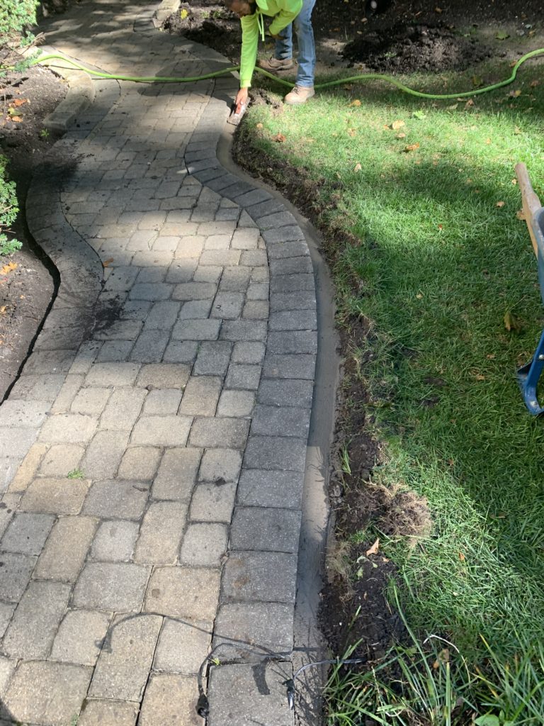 To address this issue, the first step involves excavating the dirt or mulch around the edging and completely removing the old, failed edging (Photo 4 provides a visual example). We then use our Perfect Paver Edge, a robust and flexible cement-based product, as the edge restraint system. Once installed, Perfect Paver Edge acts like a flexible rubber band around the pavers, effectively locking them in place (Photos 5, 6, and 7 demonstrate the installation process).